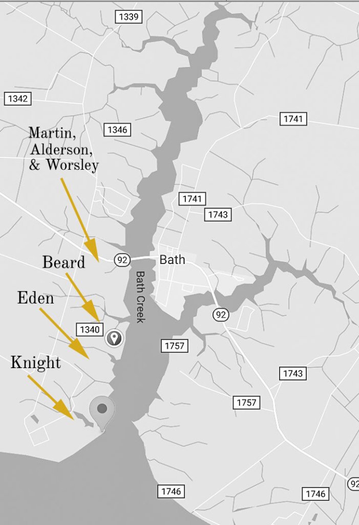 land that used to belong to Edward Salter: Duffus, Kevin. “The Last Days of Blackbeard the Pirate” 4th ed., Looking Glass Productions, Raleigh, 2014. p. 221