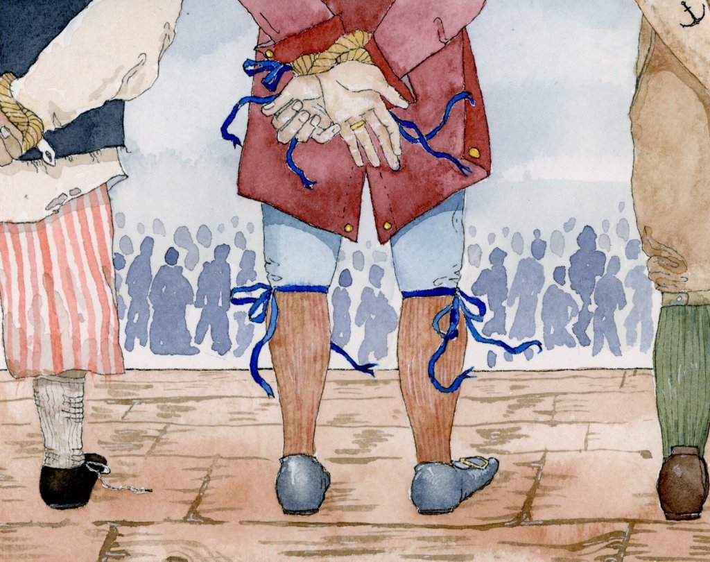 Local governments viewed pirate hangings as useful public demonstrations, a cautionary tale with a painful end. The public affair started with a grim walk (or sometimes cart ride) from imprisonment to the place of execution. Mather walked alongside Black Sam Bellamy’s crew on their procession and recorded their distress — in one case, what weighed most heavily on the marching man’s mind was his parents; another replayed his gradual decline into piracy, a liturgy of deepening regrets. Although it’s said that all people find prayer when they are looking death in the eye, multiple pirates disclosed feelings of such utter ruin, they could not even look to God. Whether out of genuine penitence or hopes for a last-minute pardon (which were granted sometimes), some pirates approached the scaffold unwashed, unshaven, visibly sobered. Others were defiant to the end. When a former gunner of Blackbeard was executed in Nassau, two of his fellow pirates decked themselves out with long blue and red ribbons streaming from their necks, wrists, hats, and knees. In Massachusetts, lead mutineer William Fly strolled the path to execution with a nosegay in hand, breezily greeting onlookers. He bounded nimbly up the platform and, given a chance for a last word, refused to grant forgiveness to those who had wronged him and said that if ship’s masters did not want to end up like his former captain (murdered), they should treat their sailors well. Still, onlookers noted, “in the midst of his affected bravery, a very sensible trembling attended him; his hands and his knees were plainly seen to tremble.”